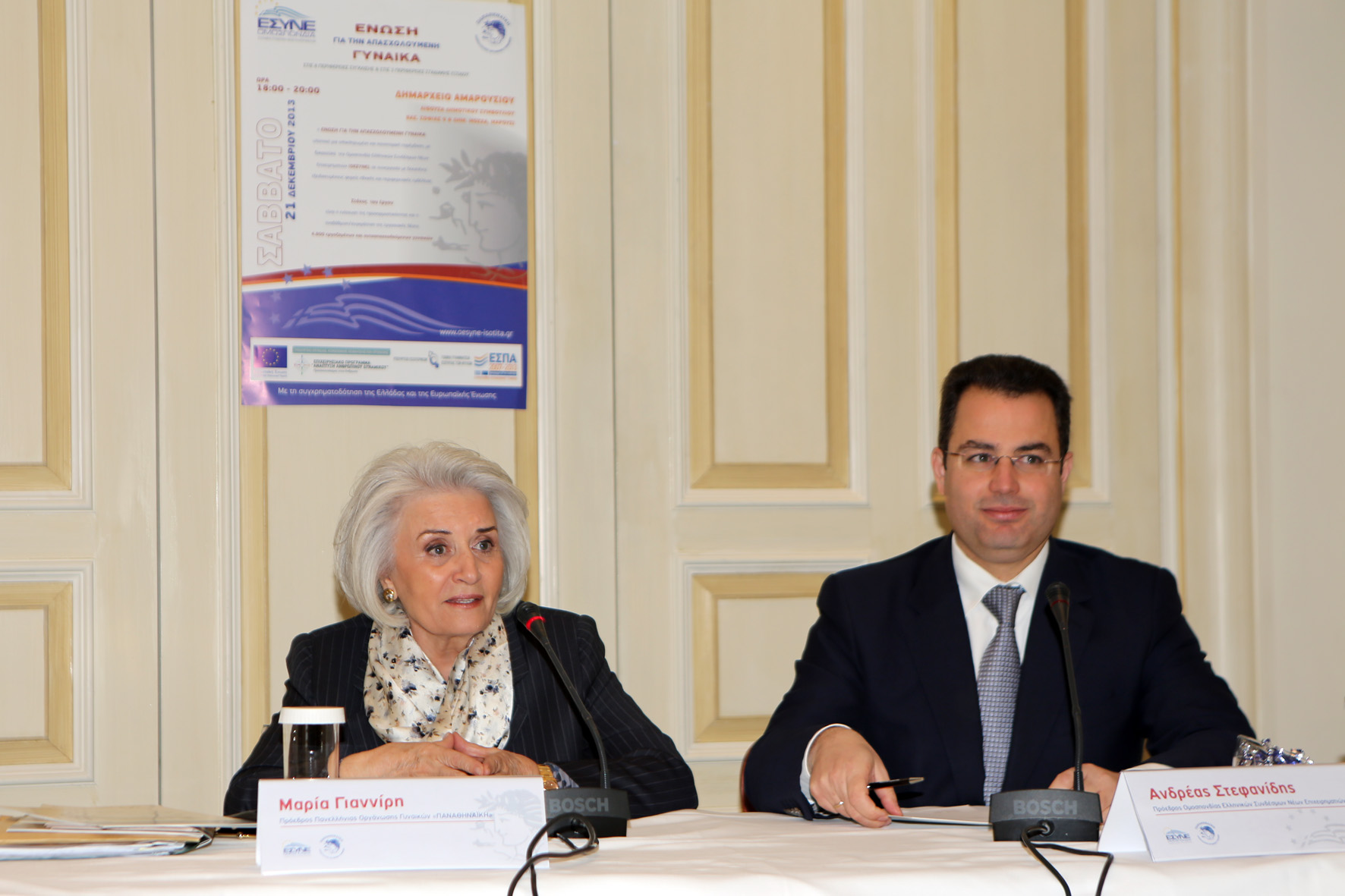 Στην συνέντευξη Τύπου παραβρέθηκαν και μίλησαν η Πρόεδρος της Πανελλήνιας Οργάνωσης Γυναικών «Παναθηναϊκή», κα Μαρία Γιαννίρη και ο Πρόεδρος της Ομοσπονδίας Ελληνικών Συνδέσμων Νέων Επιχειρηματιών, κ. Ανδρέας Στεφανίδης. Κατά τη διάρκεια της εκδήλωσης η κα Γιαννίρη δήλωσε: «Είμαστε ιδιαίτερα χαρούμενοι που συμμετέχουμε σε αυτό το πρόγραμμα και συνεργαζόμαστε με τα άλλα 14 Μέλη της Ένωσης για την Απασχολούμενη Γυναίκα. Θεωρώ πως μέσα από αυτή την πρωτοβουλία μπορούμε όλες οι γυναίκες ανά την επικράτεια να ωφεληθούμε και βγει στο προσκήνιο η γυναικεία επιχειρηματική δραστηριότητα».