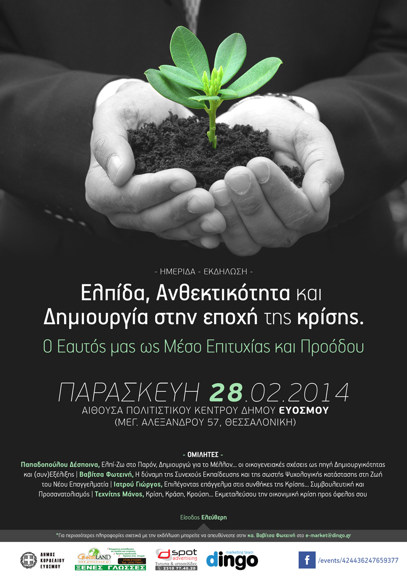 Αυτά είναι μερικά από τα ερωτήματα στα οποία θα προσπαθήσει να δώσει απαντήσεις η ημερίδα με τίτλο: ”Ελπίδα, Ανθεκτικότητα και Δημιουργία στην εποχή της κρίσης: O Εαυτός μας ως Μέσο Επιτυχίας και Προόδου”, διοργανώνεται σε συνεργασία με τη Δημοτική Κοινωφελή Επιχείρηση, την Παρασκευή 28 Φεβρουαρίου στις 6 μ.μ. στο Πολιτιστικό Κέντρο Ευόσμου (Μ. Αλεξάνδρου 57).