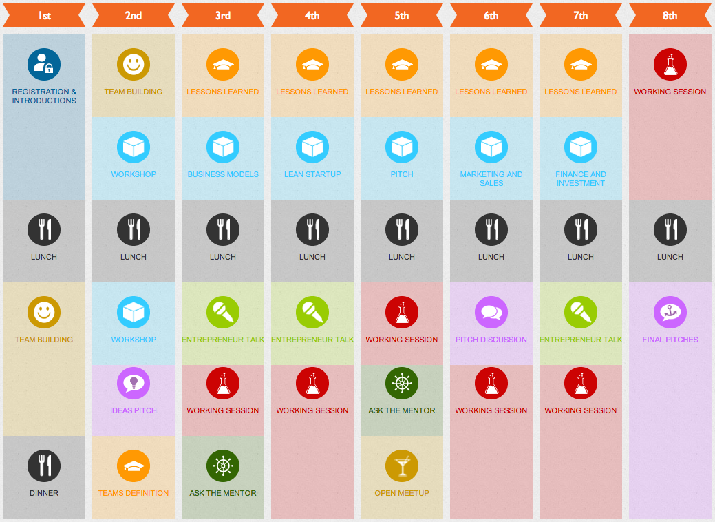 You will attend workshops about what we call the “Survival Toolbox for Entrepreneurs”. There are certain subjects we consider critical, so with the help of successful and experienced entrepreneurs, you will have access to high quality sessions that will enrich their business ideas.
