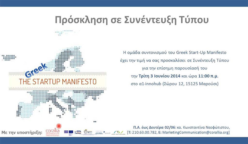 Η ομάδα συντονισμού του GreekStart–Up Manifesto έχει την τιμή να σας προσκαλέσει σε Συνέντευξη Τύπου για την επίσημη παρουσίασή του τηνΤρίτη 3 Ιουνίου 2014 και ώρα 11:00 π.μ. στο α1∙innohub (Σώρου 12, 15125 Μαρούσι).