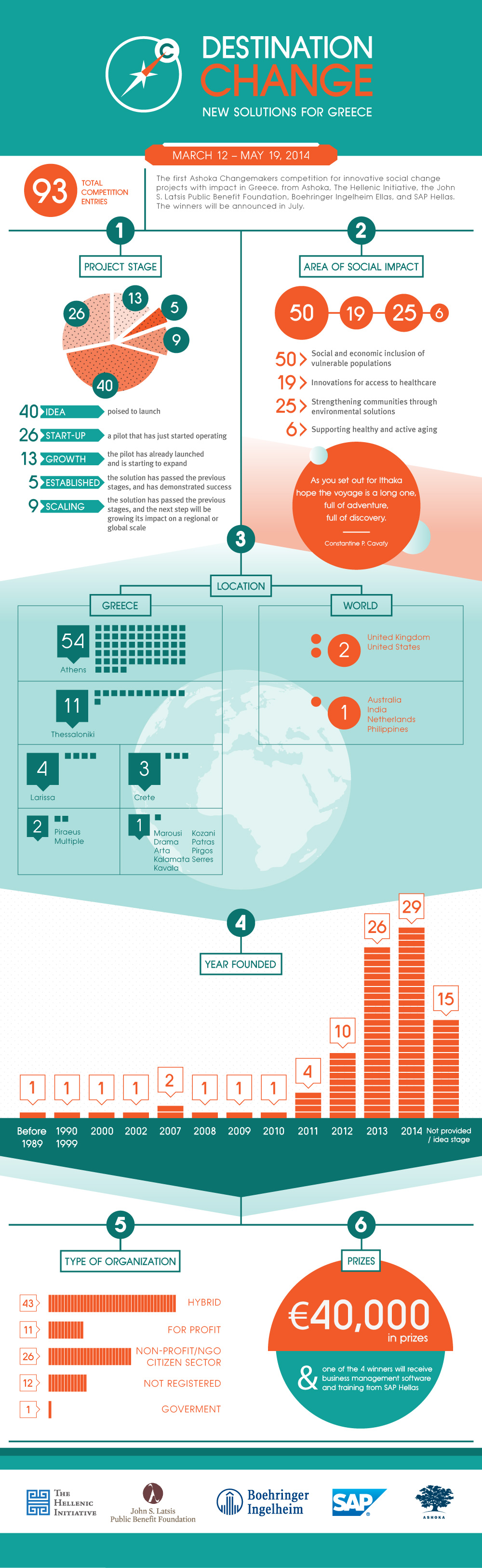 Αθήνα – 2 Ιουνίου, 2014 – Με περισσότερες από 90 συμμετοχές έκλεισε στις 19 Μαίου 2014 η προθεσμία υποβολής συμμετοχής στον διαγωνισμό «Προορισμός: Αλλαγή. Νέες Λύσεις για την Ελλάδα» (Destination: Change. New Solutions for Greece) που διοργανώνουν η Ashoka, η Ελληνική Πρωτοβουλία (Τhe Hellenic Initiative), το Κοινωφελές Ίδρυμα Ιωάννη Σ. Λάτση, η Boehringer Ingelheim Ελλάς και η SAP Hellas με στόχο την εύρεση καινοτόμων λύσεων για κοινωνική αλλαγή στην Ελλάδα. Η απήχηση του διαγωνισμού ήταν ιδιαίτερα μεγάλη: Υποβλήθηκαν συνολικά 93 προτάσεις, κυρίως από την Ελλάδα όσο και από χώρες της Ευρώπης, από τις Η.Π.Α. και άλλες χώρες. Αναμέσα στις ιδέες είναι σχήματα τόσο μη κερδοσκοπικού όσο και κερδοσκοπικού χαρακτήρα, καθώς και υβριδικά σχήματα.