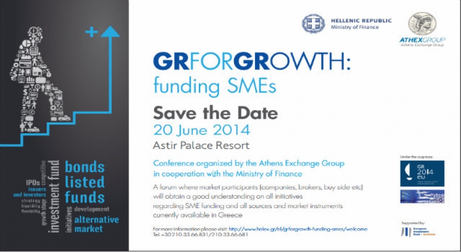 Σε μία οικονομική συγκυρία που η ανεύρεση πρόσθετων πηγών χρηματοδότησης για τις Μικρομεσαίες Επιχειρήσεις (ΜΜΕ) αποτελεί κορυφαία προτεραιότητα για την Ελλάδα και προαπαιτούμενο για την ανάπτυξη, το Χρηματιστήριο Αθηνών σε συνεργασία με το Υπουργείο Οικονομικών, διοργανώνουν Συνέδριο με θέμα «GR FOR GROWTH: funding SMEs», υπό την αιγίδα της Ελληνικής Προεδρίας της Ευρωπαϊκής Ένωσης και της Ομάδας Δράσης της Ευρωπαϊκής Ένωσης για την Ελλάδα, το οποίο θα λάβει χώρα στις 20 Ιουνίου 2014, στο Astir Palace Resort.