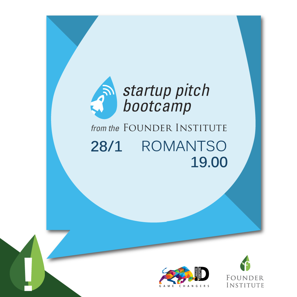 Το Athens Founder Institute και οι Industry Disruptors – Game Changers (ID-GC) διοργανώνουν την εκδήλωση Startup Pitch Bootcamp, με θέμα την βελτίωση των δεξιοτήτων παρουσίασης των επιχειρηματικών ιδεών (pitching skills), την Τετάρτη, 28 Ιανουαρίου 2015 και ώρα 19.00 στο Ρομάντσο (Αναξαγόρα 3-5, Ομόνοια).