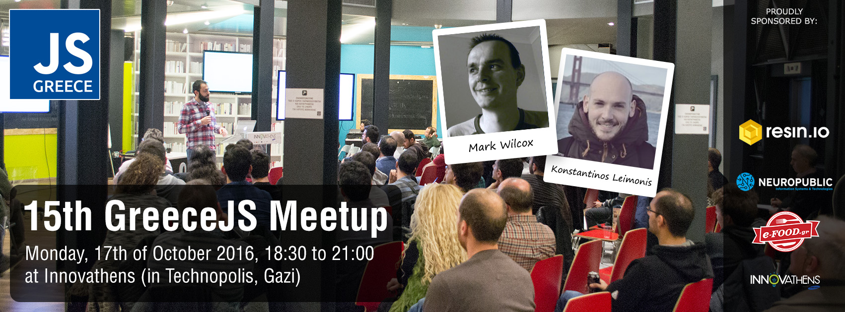 Το Greece JS, μία εθελοντική ομάδα διάδοσης και ενίσχυσης των τεχνολογιών του Web με ιδιαίτερη έμφαση στη γλώσσα προγραμματισμού JavaScript, και ο Κόμβος Καινοτομίας και Επιχειρηματικότητας της Τεχνόπολης του Δήμου Αθηναίων-INNOVATHENS σας προσκαλούν στο 15ο GreeceJS MeetUp την Δευτέρα 17 Οκωβρίου 2016 στις 18:30.