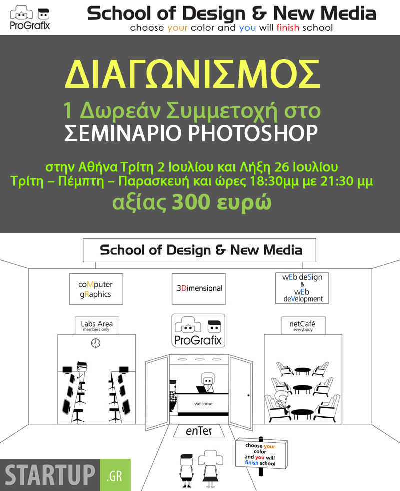 Η συμμετοχή είναι μια προσφορά της σχολής PROGRAFIX – School of Design & New Media για τους αναγνώστες του Startup.gr. ΓΙΑ ΠΕΡΙΣΣΟΤΕΡΕΣ ΠΛΗΡΟΦΟΡΙΕΣ ΜΕ ΤΟ ΣΕΜΙΝΑΡΙΟ PHOTOSHOP ΠΑΤΗΣΤΕ ΕΔΩ
