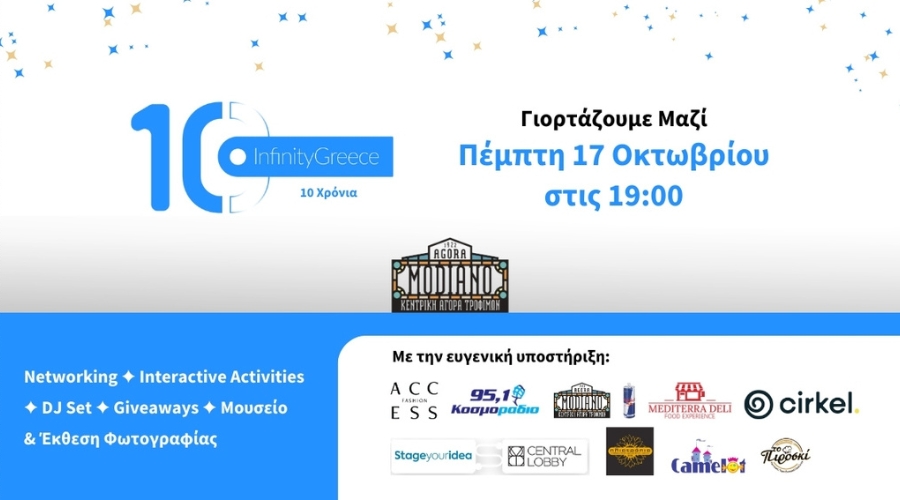 Το InfinityGreece διοργανώνει με ιδιαίτερη χαρά την εορταστική εκδήλωση για τη συμπλήρωση 10 χρόνων λειτουργίας του οργανισμού, στις 17 Οκτωβρίου 2024, στην Αγορά Μοδιάνο.