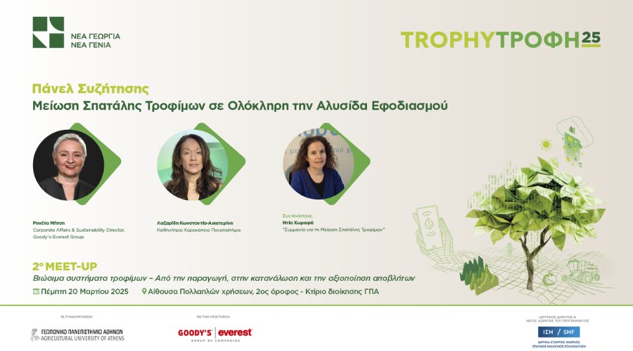 Aνακοινώνεται το δεύτερο TrophyΤροφή Meet-Up, με θέμα: «Βιώσιμα συστήματα τροφίμων – Από την παραγωγή, στην κατανάλωση και την αξιοποίηση αποβλήτων», το οποίο θα πραγματοποιηθεί την Πέμπτη 20 Μαρτίου 2025 στην Αίθουσα Πολλαπλών Χρήσεων του Γεωπονικού Πανεπιστημίου Αθηνών. Το πρόγραμμα του 2ου TrophyΤροφή Meet-Up περιλαμβάνει ομιλίες, συζητήσεις και εργαστήριο παραγωγής ιδεών, που αποσκοπούν στην προώθηση της βιωσιμότητας στην αγροδιατροφή, στην αξιοποίηση των αποβλήτων αλλά και στην προώθηση καινοτόμων ιδεών και λύσεων σε αυτά τα κρίσιμα ζητήματα.