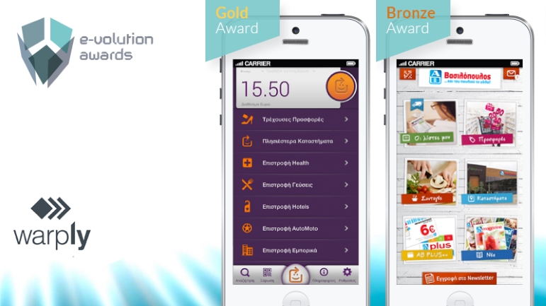 Δύο από τα mobile apps που ανήκουν στο portfolio της Warply βραβεύτηκαν στα “e-volution awards 2015” που επιβραβεύει τις πιο καινοτόμες και σύγχρονες πρακτικές στο ηλεκτρονικό επιχειρείν. Συγκεκριμένα, στην τελετή απονομής των βραβείων, την Πέμπτη 4 Δεκεμβρίου 2014, βραβευτήκαν τα mobile application “ΑΒ mobile app” και “Epistrofi” που δημιούργησε η Warply για τους στρατηγικούς συνεργάτες της ΑΒ Βασιλόπουλος και Eurobank αντίστοιχα.