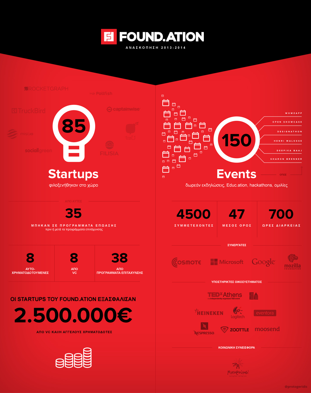 85 συνολικά startups φιλοξενήθηκαν στους χώρους του, ενώ για τις επιχειρήσεις που έχουν αξιοποιήσει τις εγκαταστάσεις και το υποστηρικτικό φάσμα των υπηρεσιών που διαθέτει, έχουν εξασφαλιστεί από Έλληνες και ξένους επενδυτές χρηματοδοτικά κεφάλαια άνω των 2.5 εκατ. ευρώ. 8 από τις ομάδες ήταν αυτό-χρηματοδοτούμενες, 8 υποστηρίχθηκαν από VCs και 38 χρηματοδοτήθηκαν μέσα από τα προγράμματα επιχειρηματικής επιτάχυνσης. 35 νέες επιχειρηματικές ομάδες παρακολούθησαν τα προγράμματα επώασης και επιχειρηματικής επιτάχυνσης που προσφέρει με τη συμμετοχή του σε δυναμικούς συνεργατικούς σχηματισμούς. Πρόκειται για ειδικά διαμορφωμένα Προγράμματα που καλύπτουν κάθε εξελικτικό στάδιο μιας νέας επιχειρηματικής προσπάθειας, από τη σύλληψη της ιδέας, μέχρι την τελική «πινελιά» σε μια ολοκληρωμένη πρόταση που μπορεί να παρουσιαστεί με αξιώσεις σε εν δυνάμει επενδυτές. Μερικές από τις εταιρείες που συνεργάστηκαν με το Found.ation είναι οι:  Sociallgreen, mist.io, TruckBird, Rocketgraph, Pollfish, captainwise, tizU, Filisia.
