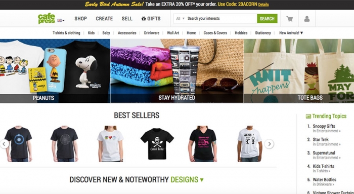 Πρόκειται για μία ιντερνετική πλατφόρμα που «τα σπάει» διεθνώς σε Αμερική, Αυστραλία, Καναδά, Ην.Βασίλειο. Σαν εταιρεία ξεκίνησε δειλά τα βήματα της το 1999 και ασχολήθηκε κυρίως με τον σχεδιασμό και την τεχνολογία του printing διαφόρων προϊόντων. Σήμερα, είναι ένας από τους μεγαλύτερους online retailers gadgets με… 11- 12 εκατομμύρια επισκέπτες του site μηνιαίως και 2 εκ. συνεργαζόμενα online καταστήματα. Δεν μπορώ να σκεφτώ κάποιο προϊόν που δεν διαθέτει το Café Press. Επειδή, η λίστα είναι ατελείωτη, καλύτερα να μπεις στο site και να δεις τα διαθέσιμα προϊόντα μόνο/η σου. Εγώ σου παραθέτω ενδεικτικά κάποια, τα οποία δείχνουν να έχουν τη μεγαλύτερη ζήτηση, όπως t-shirt, τσάντες, κούπες, γυναικεία αξεσουάρ, είδη σπιτιού, είδη μωρού, αξεσουάρ τηλεφώνου κά.