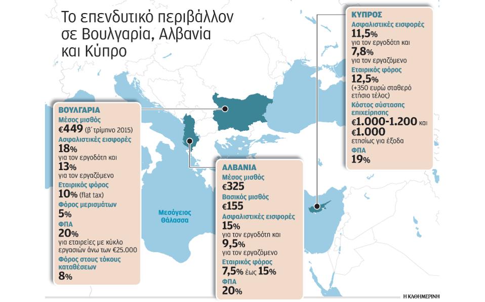 Βουλγαρία: Ο μέσος μισθός στη Βουλγαρία διαμορφώθηκε στο β΄ τρίμηνο του 2015 στα 449 ευρώ, παρουσιάζοντας αύξηση 7,6% σε ετήσια βάση. Γενικότερα, ο μέσος μισθός παρουσιάζει ανοδική τάση τα τελευταία χρόνια, ενώ από τις αρχές του 2013 μέχρι τώρα έχει αυξηθεί κατά περίπου 15%. Ο κατώτατος μηνιαίος μισθός ανέρχεται από την 1/1/2015 στα 194 ευρώ για το 8ωρο. Η Βουλγαρία επενδύει πολύ στη δημιουργία θέσεων απασχόλησης, κάτι που φαίνεται να αποδίδει, καθώς το 2014, οι άνεργοι περιορίστηκαν σε 384.500 άτομα από 433.200 που ήταν το 2013 με το ποσοστό της ανεργίας να υποχωρεί στο 11% από 13% (σ.σ.: είναι το 11ο υψηλότερο ποσοστό στην Ε.Ε). Η Βουλγαρία επιβαρύνει με 18% τον εργοδότη για τις ασφαλιστικές εισφορές (στην Ελλάδα είναι 25% και συζητείται αύξηση), ενώ για τον εργαζόμενο ο συντελεστής είναι στο 13%. Ο εταιρικός φόρος είναι ενιαίος στο 10% για φυσικά πρόσωπα και επιχειρήσεις (10%) ενώ τα μερίσματα επιβαρύνονται με 5%. Φόρος 8% επιβάλλεται στους τόκους καταθέσεων, ενώ ο ΦΠΑ (20% αντί για 23% στην Ελλάδα) επιβάλλεται μόνο στις εταιρείες με κύκλο εργασιών άνω των 25.000 ευρώ (στην Ελλάδα είναι ακόμη στις 10.000 ευρώ).