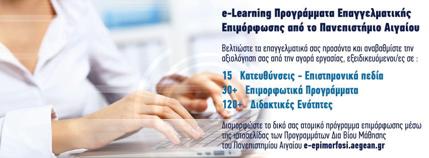 Τα εξ αποστάσεως Προγράμματα Δια Βίου Μάθησης του Πανεπιστημίου Αιγαίου συνεχίζουν με εξαιρετική επιτυχία για 4η συνεχόμενη χρονιά να καινοτομούν προσφέροντας επιμόρφωση, επαγγελματική εξειδίκευση, αλλά και προσωπική ανάπτυξη σε άτομα, που δεν έχουν τη δυνατότητα πρόσβασης σε γνώσεις και δεξιότητες, που παραδοσιακά διδάσκονται σε φοιτητές/τριες των προπτυχιακών και μεταπτυχιακών κύκλων σπουδών.