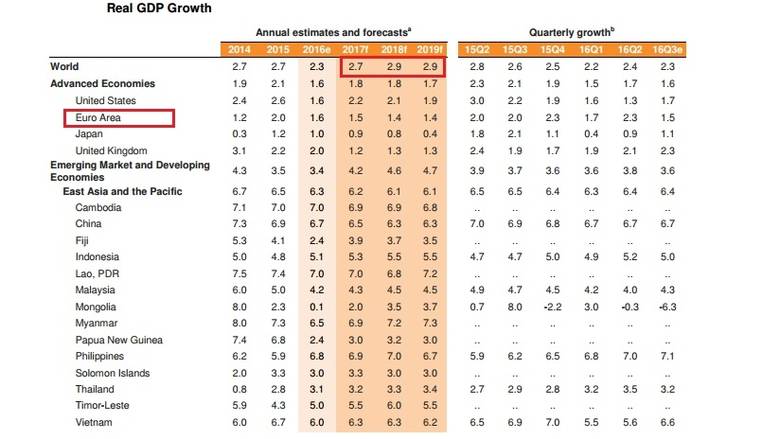 Για την Ευρωζώνη, η Παγκόσμια Τράπεζα προβλέπει μικρή επιβράδυνση της ανάπτυξης στο 1,5% από 1,6% το 2016. Για την Κίνα προβλέπει ότι ο ρυθμός ανάπτυξης της οικονομίας της θα συνεχίσει να επιβραδύνεται, υποχωρώντας στο 6,2% το 2017 από 6,7% το 2016, αλλά εκτιμά ότι θα υπάρξει ταχύτερη ανάπτυξη ορισμένων οικονομιών της Νοτιοανατολικής Ασίας, όπως της Ινδονησίας και της Ταϊλάνδης. Η ανάπτυξη της ινδικής οικονομίας αναμένεται να επιταχυνθεί, αυξανόμενη στο 7,6% το 2017 από 7% το 2016, καθώς οι μεταρρυθμίσεις μειώνουν τη στενότητα στην εγχώρια προσφορά και αυξάνουν την παραγωγικότητα.