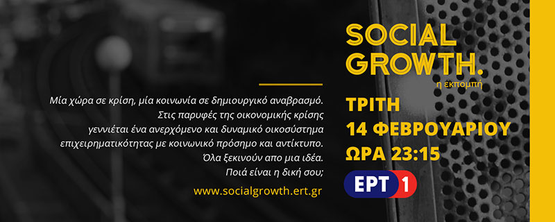 Στις παρυφές της οικονομικής κρίσης γεννιέται ένα ανερχόμενο και δυναμικό οικοσύστημα επιχειρηματικότητας με κοινωνικό πρόσημο και αντίκτυπο. Ιστορίες κοινωνικών επιχιερηματιών, επενδυτές, κοινωνικοί χρηματοδότες και ειδήμονες μέντορες είναι οι πρωταγωνιστές της νέας παραγωγής της ΕΡΤ, Social Growth κάθε Τρίτη στις 23:15 το βράδυ στην ΕΡΤ1 και ζωντανά σε όλο τον κόσμο μέσω της ERT WEBTV. Το Social Growth δίνει στο κοινό την ευκαιρία να διαγωνιστεί ζωντανά στο τελευταίο επεισόδιο παρουσιάζοντας τις ιδέες του για ίδρυση κοινωνικών επιχειρήσεων. Οι νικητές θα κερδίσουν την ένταξη τους στις μεγαλυτερες δομές στήριξης για να κάνουν το όνειρο τους πραγματικότητα και θα γίνουν εκείνοι οι πρωταγωνιστές του αύριο.