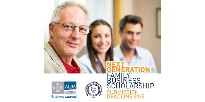 Αναγνωρίζοντας τη σημασία των οικογενειακών επιχειρήσεων στην Ελληνική οικονομία, αλλά και τις δυσκολίες που αντιμετωπίζουν οι διάδοχοι των επιχειρήσεων όσον αφορά την εφαρμογή νέων καινοτόμων πρακτικών, το ALBA Graduate Business School προσφέρει για δεύτερη χρονιά τις υποτροφίες «Next Generation Family Business Scholarship» Οι υποτροφίες αυτές αποτελούν έμπρακτη προσπάθεια για την ενθάρρυνση της ανάπτυξης των οικογενειακών επιχειρήσεων και της επιτυχημένης διαδοχής σε αυτές.