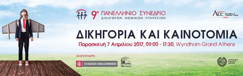 Στις 7 Απριλίου 2017, στο ξενοδοχείο Wyndham Grand Athens, θα πραγματοποιηθεί το 9o Πανελλήνιο Συνέδριο Δικηγόρων Νομικών Υπηρεσιών με θέμα: «Δικηγορία και Καινοτομία».