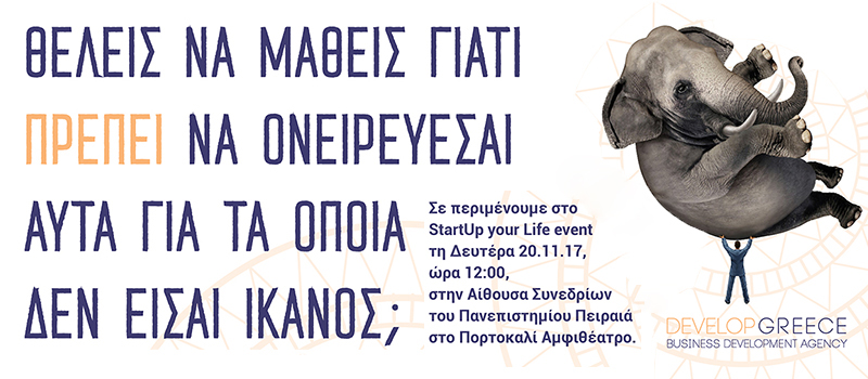 Η Develop Greece, η διαρκώς ανερχόμενη Business Development εταιρεία που εδρεύει στην περιοχή της Ακρόπολης, θα συμμετέχει ως βασικός ομιλητής στο «StartUp your Life Event» που θα λάβει χώρα τη Δευτέρα 20 Νοεμβρίου 2017 στην Αίθουσα Συνεδρίων του Πανεπιστημίου Πειραιά στο Πορτοκαλί Αμφιθέατρο, στις 12:00-16:00 μ.μ.