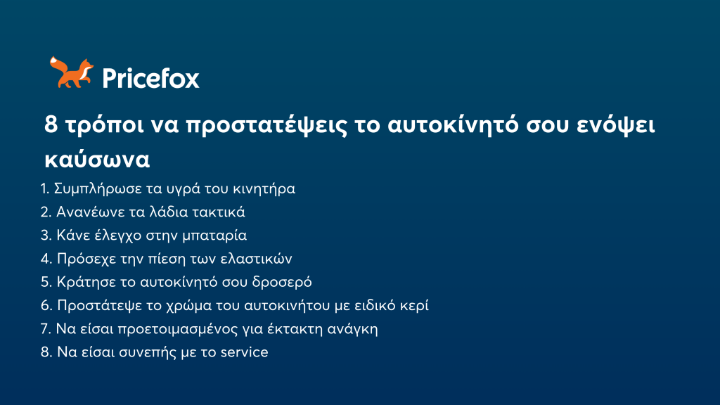 Το Pricefox, ο σύμβουλός σου στην εξοικονόμηση και η πλατφόρμα που σε βοηθάει να βρεις την πληρέστερη μικτή ασφάλεια για το αυτοκίνητό σου, σου προτείνει 8 τρόπους για να προστατέψεις το αυτοκίνητό σου ενόψει των υψηλών θερμοκρασιών του καλοκαιριού, ώστε να αποφύγεις ζημιές και έκτακτα έξοδα.
