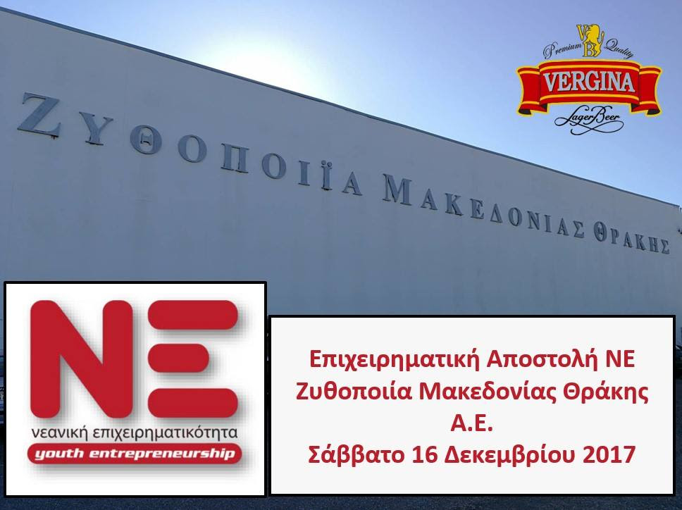 Ο όμιλος Νεανικής Επιχειρηματικότητας- ΝΕ σας προσκαλεί σε μια εξαιρετική επιχειρηματική αποστολή το Σάββατο 16 Δεκεμβρίου σε μια αμιγώς ελληνική εταιρεία πρότυπο στον χώρο του Ζύθου και της ελληνικής οικονομίας , την Ζυθοποιοία Μακεδονιας – Θράκης ΑΕ ! Στην την Ζυθοποιοία Μακεδονιας – Θράκης ΑΕ θα μας υποδεχθεί κύριος Κρις Χρυσοχοΐδης Διευθυντής Εταιρικής Ανάπτυξης της Ζυθοποιίας Μακεδονίας Θράκης Α.Ε. και Διευθύνων Σύμβουλος της TUVUNU Α.Ε. όσο για το θέμα της ομιλίας θα είναι «Καινοτομία και Επιχειρείν».