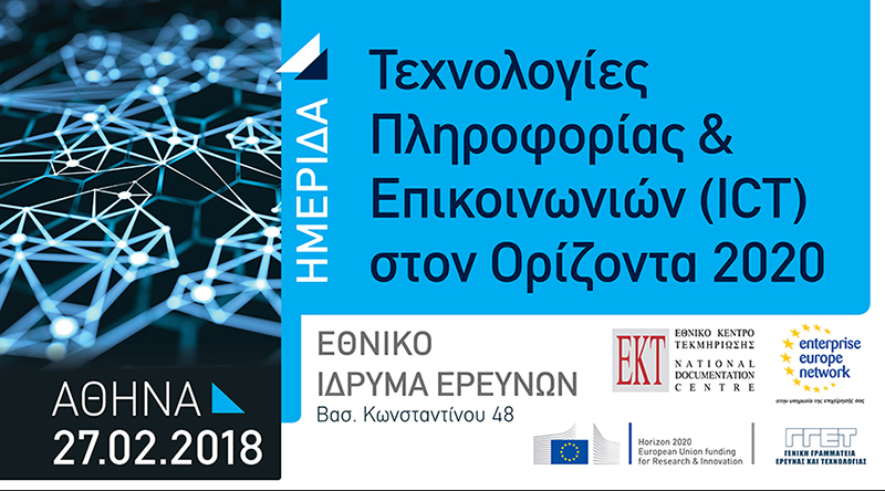 Το Εθνικό Κέντρο Τεκμηρίωσης, Εθνικό Σημείο Επαφής για το Πρόγραμμα Πλαίσιο “Ορίζοντας 2020” της Ευρωπαϊκής Επιτροπής (ΕΕ), διοργανώνει ενημερωτική ημερίδα με θέμα “Τεχνολογίες Πληροφορίας & Επικοινωνιών (ICT) στον Ορίζοντα 2020”. Η εκδήλωση, η οποία διοργανώνεται με την υποστήριξη της Ευρωπαϊκής Επιτροπής και της Γενικής Γραμματείας Έρευνας και Τεχνολογίας, θα πραγματοποιηθεί την Τρίτη 27 Φεβρουαρίου 2018 (09.30-15.00) στο Εθνικό Ίδρυμα Ερευνών, Αμφιθέατρο Λ. Ζέρβας (Βασ. Κωνσταντίνου 48, Αθήνα).
