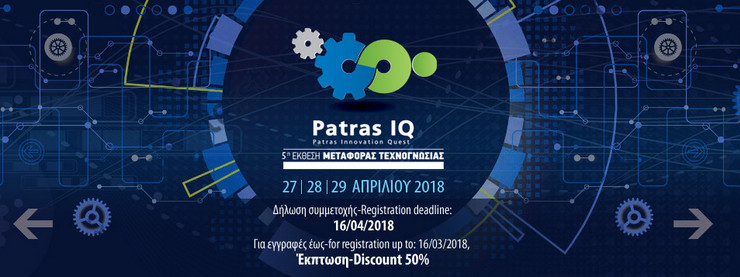 Η 5η Έκθεση Μεταφοράς Τεχνογνωσίας – Patras Innovation Quest (Patras IQ) θα πραγματοποιηθεί στις 27, 28 και 29 Απριλίου 2018, στο Αθλητικό Κέντρο «Δ. Τόφαλος» της Πάτρας και συνδιοργανώνεται από το Πανεπιστήμιο Πατρών, το Υπουργείο Παιδείας, Έρευνας & Θρησκευμάτων, το Υπουργείο Οικονομίας & Ανάπτυξης, το Επιμελητήριο Αχαΐας, την Περιφέρεια Δυτικής Ελλάδας, το Ελληνικό Ανοικτό Πανεπιστήμιο και το Τεχνολογικό Εκπαιδευτικό Ίδρυμα Δυτικής Ελλάδας.