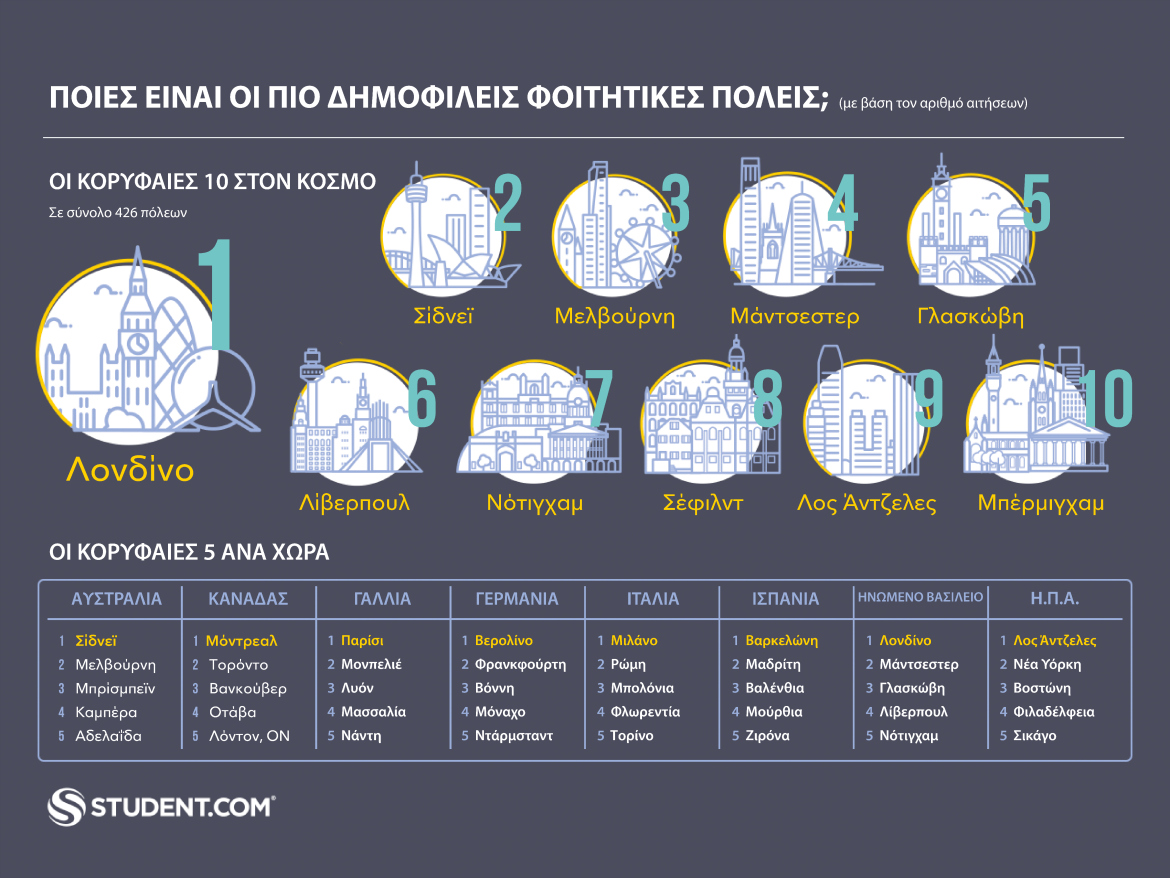 Το Λονδίνο αποτελεί τη δημοφιλέστερη φοιτητική πόλη, ενώ το Σίδνεϊ, η Μελβούρνη και το Μάντσεστερ καταλαμβάνουν τη δεύτερη, τρίτη και τέταρτη σειρά αντιστοίχως. Παράλληλα, η Student.com αποκαλύπτει τις κορυφαίες φοιτητικές πόλεις στην Αυστραλία, τον Καναδά, τη Γαλλία, τη Γερμανία, την Ιταλία, το Ηνωμένο Βασίλειο και τις Η.Π.Α.