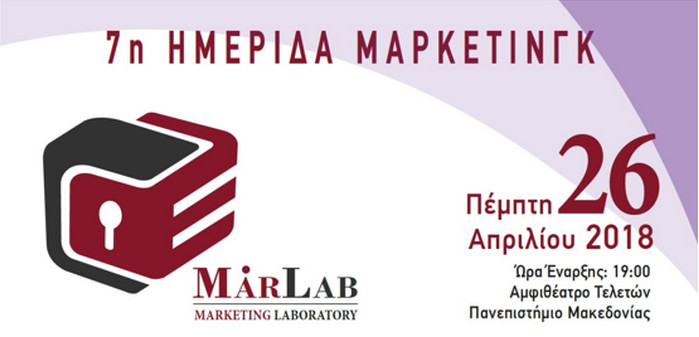 Αναγνωρίζοντας τη σημαντικότητα τους, το Εργαστήριο Μάρκετινγκ MARLAB και το Τμήμα Οργάνωσης και Διοίκησης Επιχειρήσεων του Πανεπιστημίου Μακεδονίας διοργανώνουν Ημερίδα Μάρκετινγκ με θέμα: «ΕΡΕΥΝΑ ΜΑΡΚΕΤΙΝΓΚ, BIG DATA, MARKETING ANALYTICS: ΣΥΓΧΡΟΝΑ ΕΡΓΑΛΕΙΑ ΒΕΛΤΙΣΤΟΠΟΙΗΣΗΣ ΕΠΙΧΕΙΡΗΜΑΤΙΚΩΝ ΑΠΟΦΑΣΕΩΝ». Η ημερίδα θα πραγματοποιηθεί την Πέμπτη, 26 Απριλίου 2018, ώρα 19:00, στο Αμφιθέατρο Τελετών του Πανεπιστημίου Μακεδονίας.