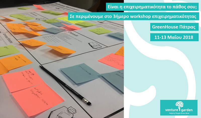 Το VentureGardenμε την υποστήριξη του Επιστημονικού Πάρκου Πατρών φέρνει το GreenHouse στην Πάτρα από 11 έως 13 Μαΐου 2018. ΤoGreenHouse είναι ένα δωρεάν εντατικό εκπαιδευτικό τριήμερο που βοηθά τους συμμετέχοντες να έρθουν πιο κοντά στην επιχειρηματική σκέψη και δράση!