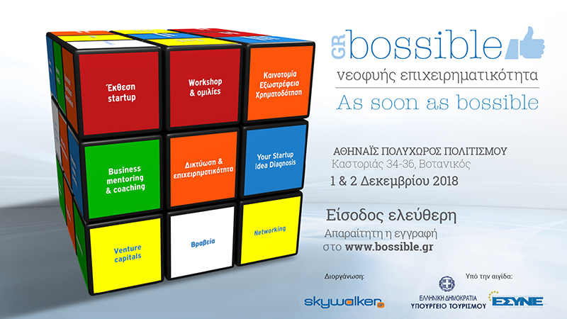 Το Φεστιβάλ Νεοφυούς Επιχειρηματικότητας GRBossible διοργανώνεται υπό την αιγίδα τουυπουργείου Τουρισμού και του Ε.ΣΥ.Ν.Ε. ΑΠΠ και θα διεξαχθεί στον Πολυχώρο Πολιτισμού Αθηναΐς στη 1 και στις 2 Δεκεμβρίου 2018.