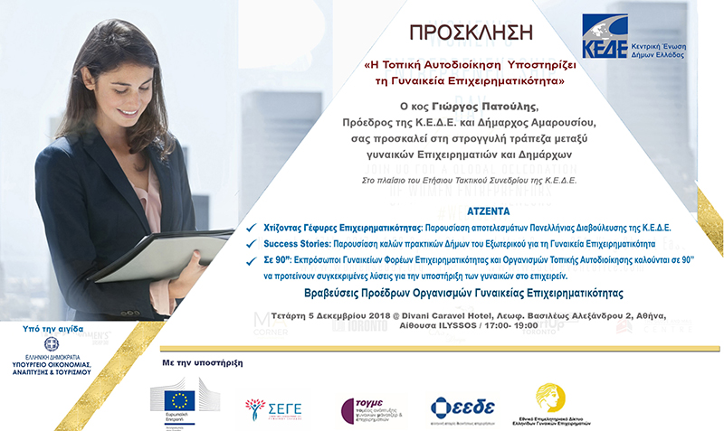 Αθήνα, 3 Δεκεμβρίου 2018. Τα αποτελέσματα της πανελλήνιας διαβούλευσης της ΚΕΔΕ «Πώς η Τοπική Αυτοδιοίκηση θα Υποστηρίξει τις Γυναίκες στο Επιχειρείν» θα παρουσιαστούν από τον Πρόεδρο της ΚΕΔΕ κ. Γιώργο Πατούλη στο Ετήσιο Συνέδριο της ΚΕΔΕ και την ενότητα με θέμα: «Η Τοπική Αυτοδιοίκηση Υποστηρίζει τη Γυναικεία Επιχειρηματικότητα» που θα πραγματοποιηθεί την Τετάρτη 5 Δεκεμβρίου 2018 και ώρα 17:00- 19:00 στο Divani Caravel Αθήνα.