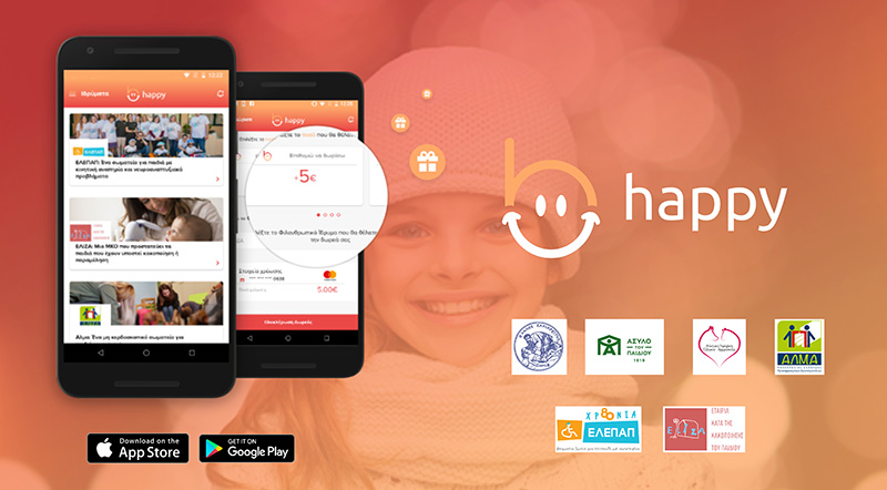 To happy είναι η πρώτη εφαρμογή για κινητά, που δίνει τη δυνατότητα στους χρήστες να βοηθήσουν οικονομικά φιλανθρωπικά ιδρύματα που έχουν ανάγκη, προσφέροντας εύκολα και άμεσα τη δωρεά τους μέσα από την εφαρμογή. Τα ιδρύματα στα οποία μπορείτε να δωρίσετε μέσα από την εφαρμογή happy είναι τα εξής: ΕΛΕΠΑΠ, Ελίζα, ΑΛΜΑ, Άσυλο του Παιδιού, Καλός Σαμαρίτης, Γραμμή Ζωής, Φιλοζωική Παρέμβασης Αργυρούπολης – Ελληνικού και σύντομα θα προστεθούν και άλλα.
