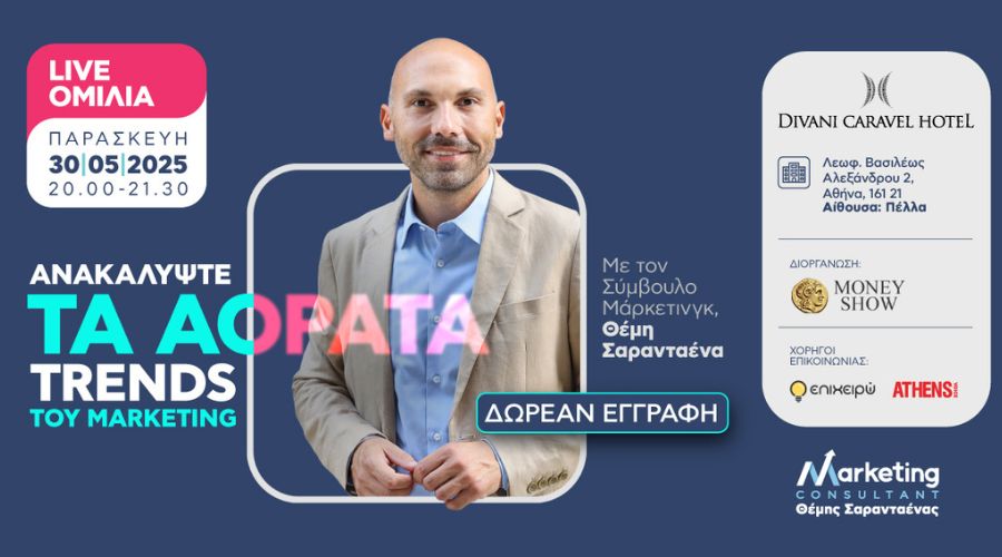O σύμβουλος μάρκετινγκ Θέμης Σαρανταένας θα βρίσκεται για μια ακόμη φορά στην διοργάνωση Money Show στην Αθήνα όπου θα παρουσιάσει την ομιλία – συζήτηση με θέμα: «Ανακαλύψτε τα Αόρατα Trends του Marketing: Στρατηγικές για Επιχειρηματική Επιτυχία». Η ομιλία θα πραγματοποιηθεί την Παρασκευή 30 Μαΐου 2025 στις 20.00 – 21.30 με δωρεάν συμμετοχή (απαραίτητη η προεγγραφή για την εξασφάλιση θέσης).