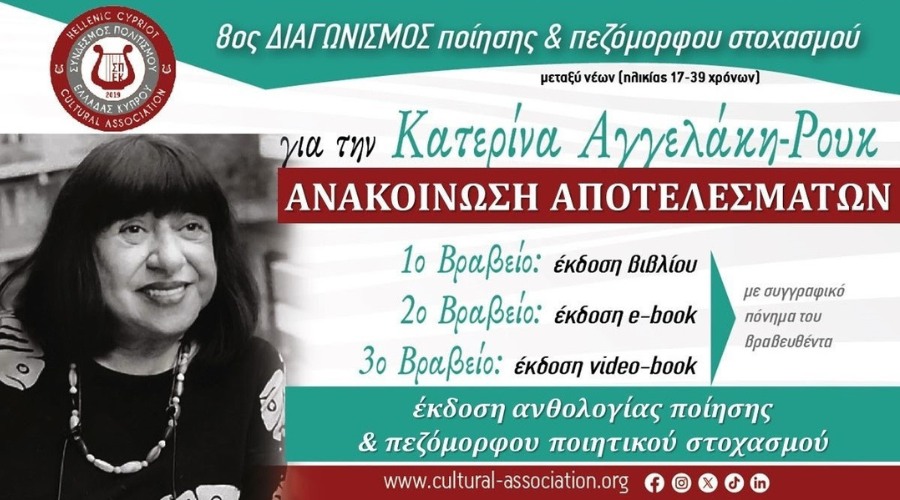 Ο Σύνδεσμος Πολιτισμού Ελλάδας Κύπρου βρίσκεται στην ευχάριστη θέση να ανακοινώσει τα αποτελέσματα του 8ου Διαγωνισμού Ποίησης και Πεζόμορφου Ποιητικού Στοχασμού “Για την Κατερίνα Αγγελάκη – Ρουκ”. Ο διαγωνισμός ολοκληρώθηκε με ισχυρή συμμετοχή 200 νέων από Ελλάδα, Κύπρο και Ομογένεια. Η Κριτική Επιτροπή του Διαγωνισμού, βάσει κριτηρίων που διέπουν τις αρχές της λογοτεχνίας, της ποίησης και της γλώσσας, αλλά και σύμφωνα με πρόσθετα κοινωνικά και πολιτισμικά κριτήρια, μελέτησε τις συμμετοχές που κατατέθηκαν και επέλεξε τις 77 που ξεχώρισαν.