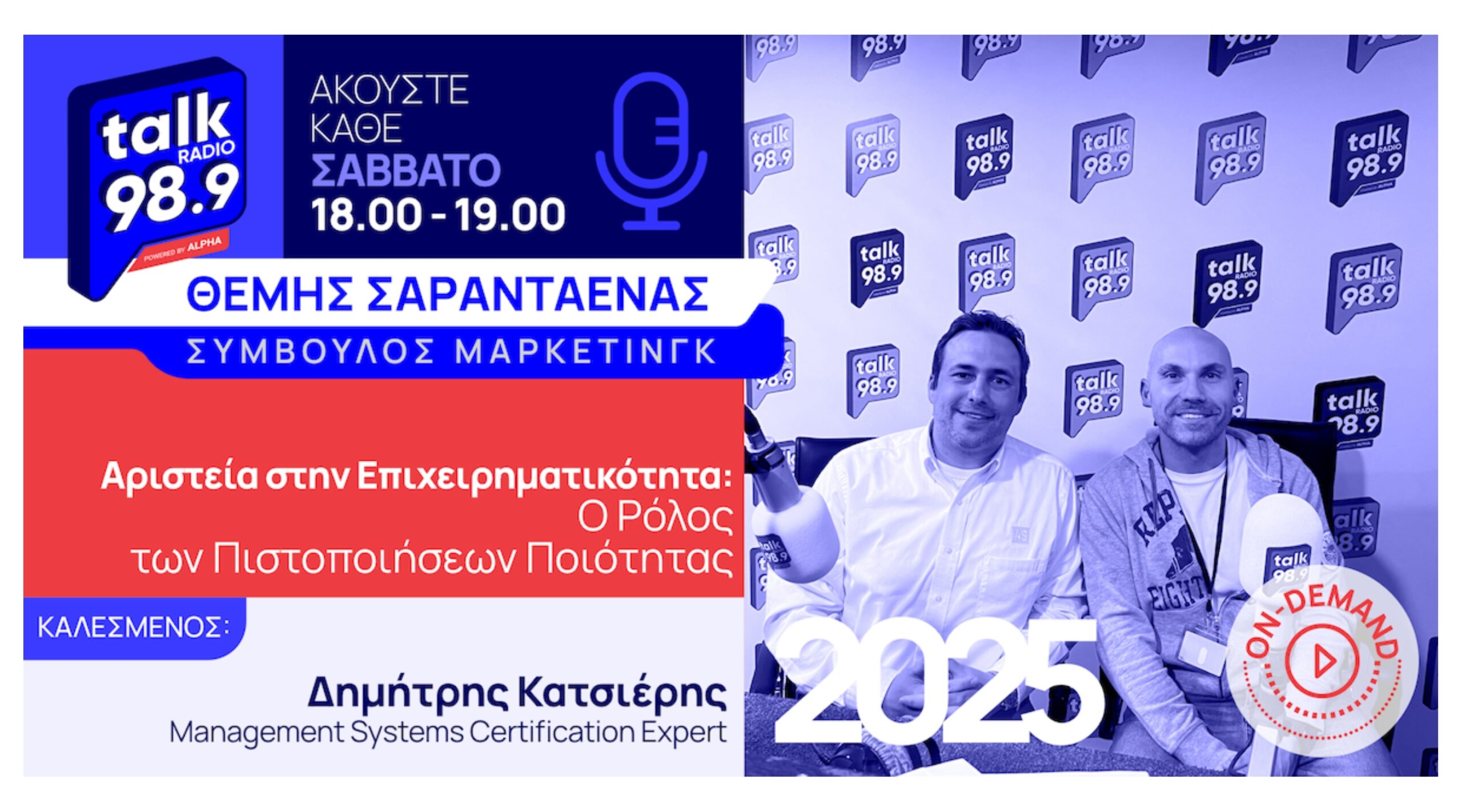 Ο σύμβουλος μάρκετινγκ Θέμης Σαρανταένας με καλεσμένο του στο studio του Talk Radio 989 by Alpha τον Management Systems Certification Expert Δημήτρης Κατσίερης εξερεύνησαν τον ρόλο των πιστοποιήσεων ποιότητας στην επιχειρηματική επιτυχία, ανέλυσαν τη διαδικασία απόκτησης και εφαρμογής τους και παρουσίασαν πώς αυτές μπορούν να προσφέρουν ένα ισχυρό ανταγωνιστικό πλεονέκτημα.