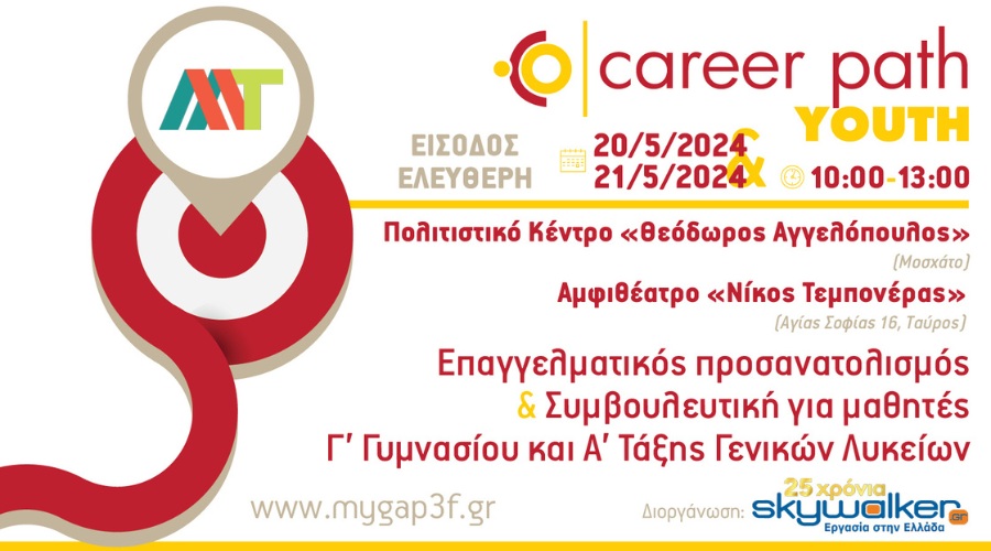 Το skywalker.gr – Εργασία στην Ελλάδα, στο πλαίσιο των πρωτοβουλιών που αφορούν την εκπαίδευση, σε συνεργασία με τον Δήμο Μοσχάτου-Ταύρου, διοργανώνει τη δράση Career Path Youth τη Δευτέρα 20 Μαΐου και την Τρίτη 21 Μαΐου, και ώρες 10:00-13:00. Το σεμινάριο της 20ής Μαΐου αφορά τους μαθητές της Γ’ Γυμνασίου και θα πραγματοποιηθεί στο Πολιτιστικό Κέντρο «Θεόδωρος Αγγελόπουλος» (αμφιθέατρο «Τζένη Βάνου», Κωνσταντινουπόλεως και Σολωμού, Μοσχάτο), ενώ το αντίστοιχο της 21ης Μαΐου αφορά τους μαθητές της Γ’ Γυμνασίου και της Α’ Τάξης των Γενικών Λυκείων και θα πραγματοποιηθεί στο αμφιθέατρο «Νίκος Τεμπονέρας» (Αγίας Σοφίας 16, Ταύρος).