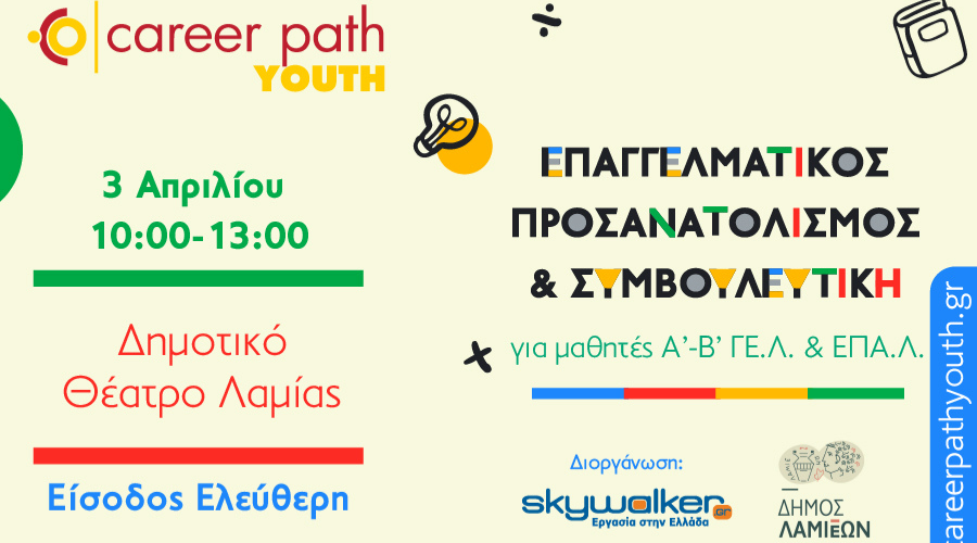 Το skywalker.gr – Εργασία στην Ελλάδα, στο πλαίσιο των πρωτοβουλιών που αφορούν την εκπαίδευση, σε συνεργασία με τον Δήμο Λαμιέων, διοργανώνει τη δράση Career Path Youth, την Πέμπτη 3 Απριλίου και ώρες 10:00-13:00. Το σεμινάριο αφορά τους μαθητές της Α’ και Β’ Τάξης ΓΕ.Λ. και ΕΠΑ.Λ. και θα πραγματοποιηθεί στο Δημοτικό Θέατρο Λαμίας (Υψηλάντου 24, ΤΚ: 35100, Λαμία).