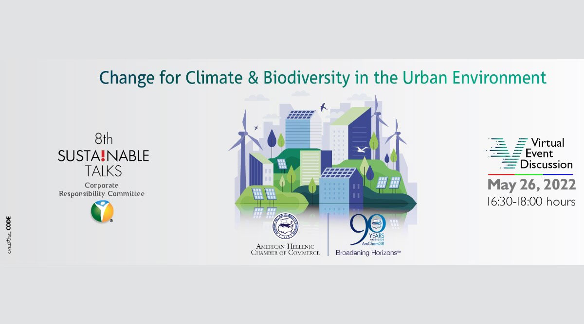 Με ιδιαίτερη επιτυχία το Ελληνο-Αμερικανικό Εμπορικό Επιμελητήριο, με τη συνεργασία της Επιτροπής Εταιρικής Υπευθυνότητας, διοργάνωσε το 8ο Sustainable Talks με τίτλο “Change for Climate & Biodiversity in the Urban Environment“, την Πέμπτη 26 Μαΐου 2022, στο πλαίσιο σειράς μονοθεματικών συζητήσεων με τίτλο Sustainable Talks, που έχουν στόχο την ενσωμάτωση των Στόχων Βιώσιμης Ανάπτυξης των Ηνωμένων Εθνών στην Ελληνική επιχειρηματική πραγματικότητα μέσω εποικοδομητικού διαλόγου.