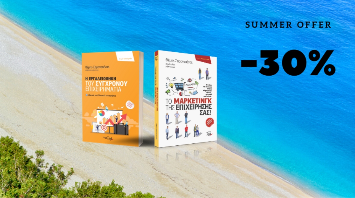 Το καλοκαίρι ήρθε, και τώρα είναι η καλύτερη περίοδος για χαλάρωση (πάντα με ασφάλεια) και επαναπροσδιορισμό των επιχειρηματικών σχεδίων σας. Για αυτήν την περίοδο μπορείτε να επωφεληθείτε με μια έκπτωση -30% στην αγορά δύο επιχειρηματικών βιβλίων του συμβούλου μάρκετινγκ Θέμη Σαρανταένα από τις εκδόσεις Rosili: