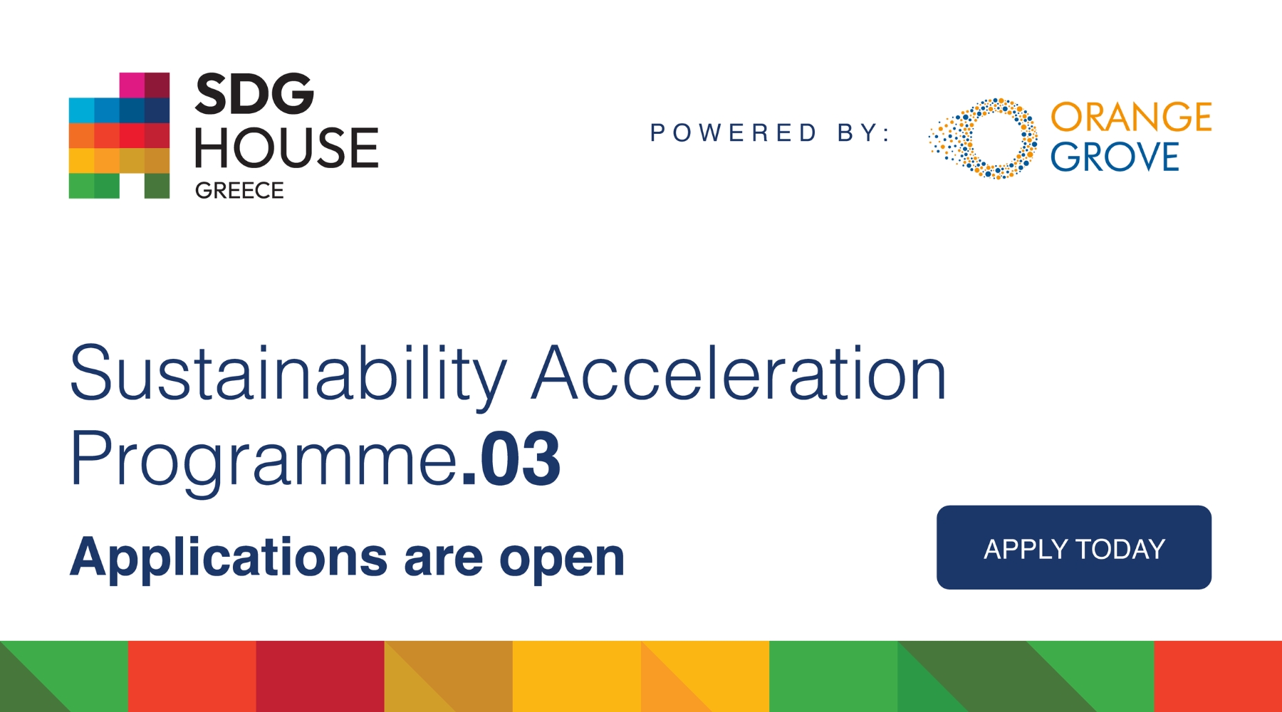 Το SDG House Greece, που αποτελεί τη νέα πρωτοβουλία του Orange Grove και της Ολλανδικής Πρεσβείας, ανακοινώνει την έναρξη υποβολής αιτήσεων για το τρίτο Sustainability Acceleration Programme, ένα εντατικό online πρόγραμμα εκπαίδευσης επιχειρήσεων σε εργαλεία και δεξιότητες για την ενσωμάτωση βιώσιμων πρακτικών στο επιχειρηματικό μοντέλο και τη λειτουργία τους.