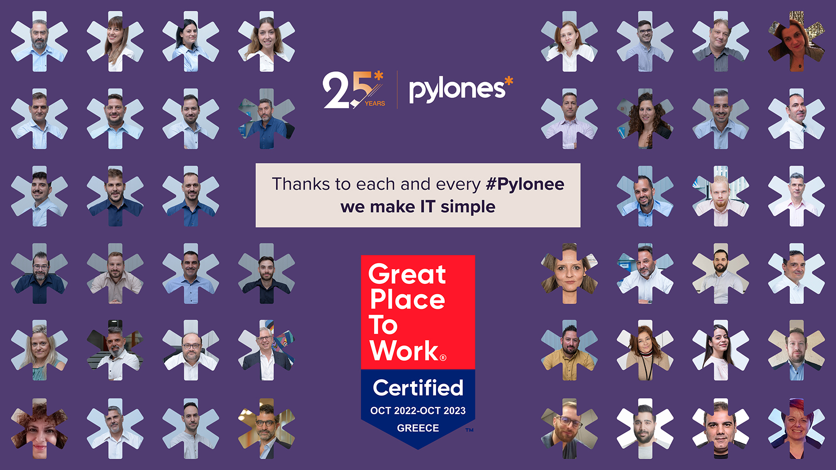 H Pylones Hellas, πάροχος ψηφιακών τεχνολογιών και ασφάλειας διαδικτύου, με μακρά παρουσία 25 και πλέον ετών σε Ελλάδα, Κύπρο και Ν.Α. Ευρώπη, πιστοποιήθηκε για 3η συνεχή χρονιά για το υψηλού επίπεδου εργασιακό περιβάλλον της ως Great Place to Work® μετά από αξιολόγηση του ανθρώπινου δυναμικού της.