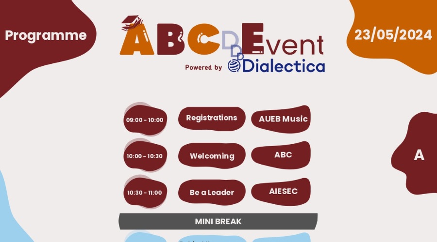 Επιπλέον, στο «ABC Event, powered by Dialectica» θα συζητηθούν θέματα σχετικά με τη βιωσιμότητα και το ΕSG, τον αντίκτυπο της Τεχνητής Νοημοσύνης στο πεδίο της εργασίας, καθώς και θέματα ηγεσίας και διαπραγματεύσεων. Στο συνέδριο θα συμμετάσχουν φοιτητικές ομάδες όπως το ThinkBiz, η AIESEC, η Get Involved, η Mercury Negotiations Academy, το Erasmus Student Network, η UniAI, το TEDxAUEB, το Athens Negotiations Tournament μεταξύ άλλων.