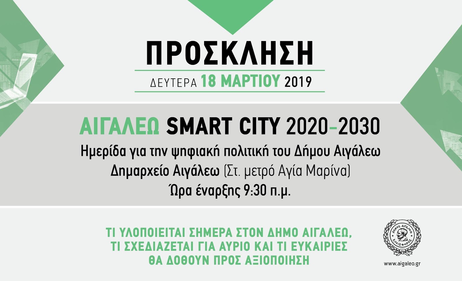 Στο Δημαρχείο Αιγάλεω, στην αίθουσα του Δημοτικού Συμβουλίου (Ιερά Οδός 364 & Κάλβου- Στ. μετρό Αγία Μαρίνα), θα πραγματοποιηθεί τη Δευτέρα 18 Μαρτίου 2019, από τις 09:30 μέχρι τις 15:00, ημερίδα για την ψηφιακή πολιτική.