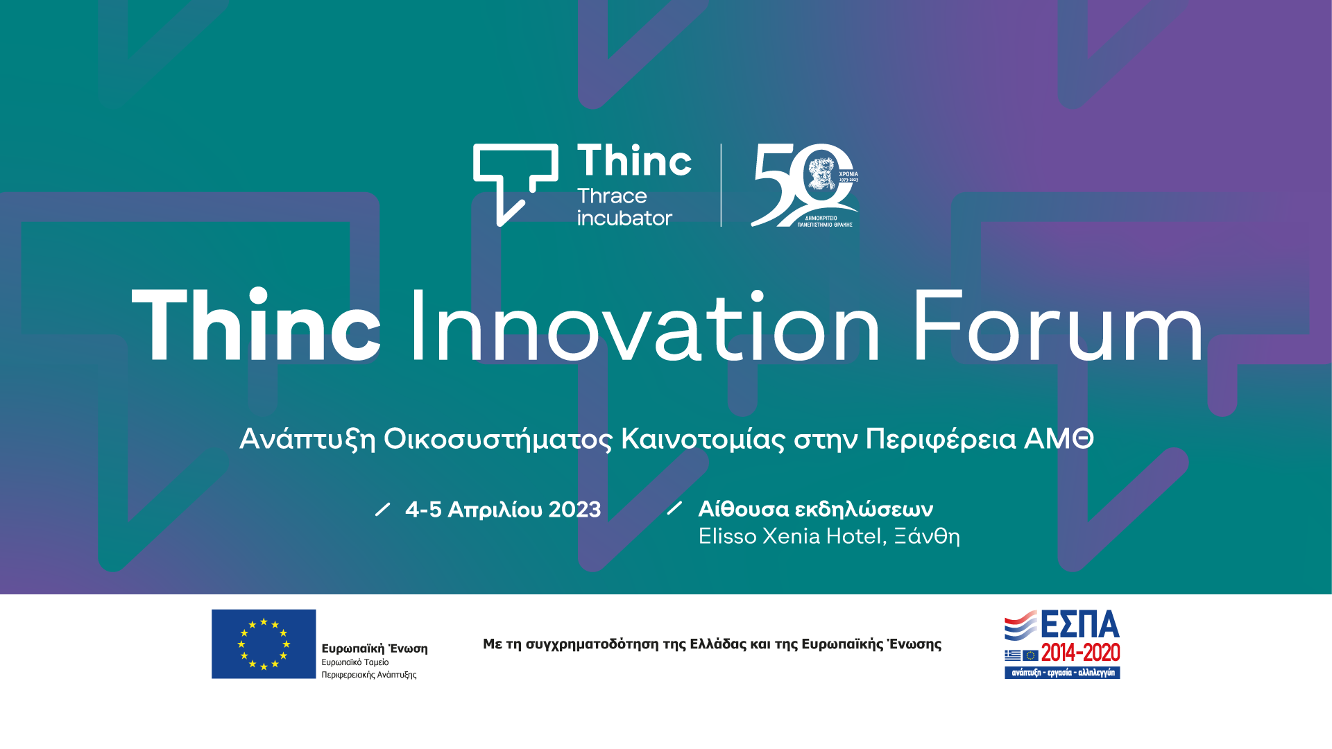 Η Θερμοκοιτίδα Επιχειρήσεων του Δημοκρίτειου Πανεπιστημίου Θράκης, Thinc – Thrace incubator, διοργανώνει το 1ο Συνέδριο Καινοτομίας με τίτλο «ΤHINC INNOVATION FORUM – Ανάπτυξη οικοσυστήματος καινοτομίας στην Περιφέρεια Ανατολικής Μακεδονίας και Θράκης», την Τρίτη 4 και την Τετάρτη 5 Απριλίου 2023, στο Elisso Xenia Hotel, στην πόλη της Ξάνθης.