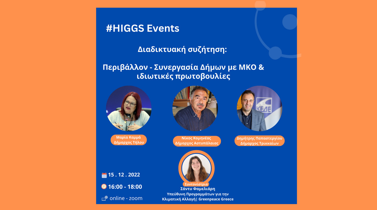 Την Πέμπτη 15 Δεκεμβρίου (16:00 – 18.00μμ), το HIGGS σε συνεργασία με τους Δήμους Αστυπάλαιας, Τήλου και Τρικκαίων, διοργανώνει ανοιχτή διαδικτυακή συζήτηση με θέμα «Περιβάλλον: Συνεργασία Δήμων με ΜΚΟ & ιδιωτικές πρωτοβουλίες».