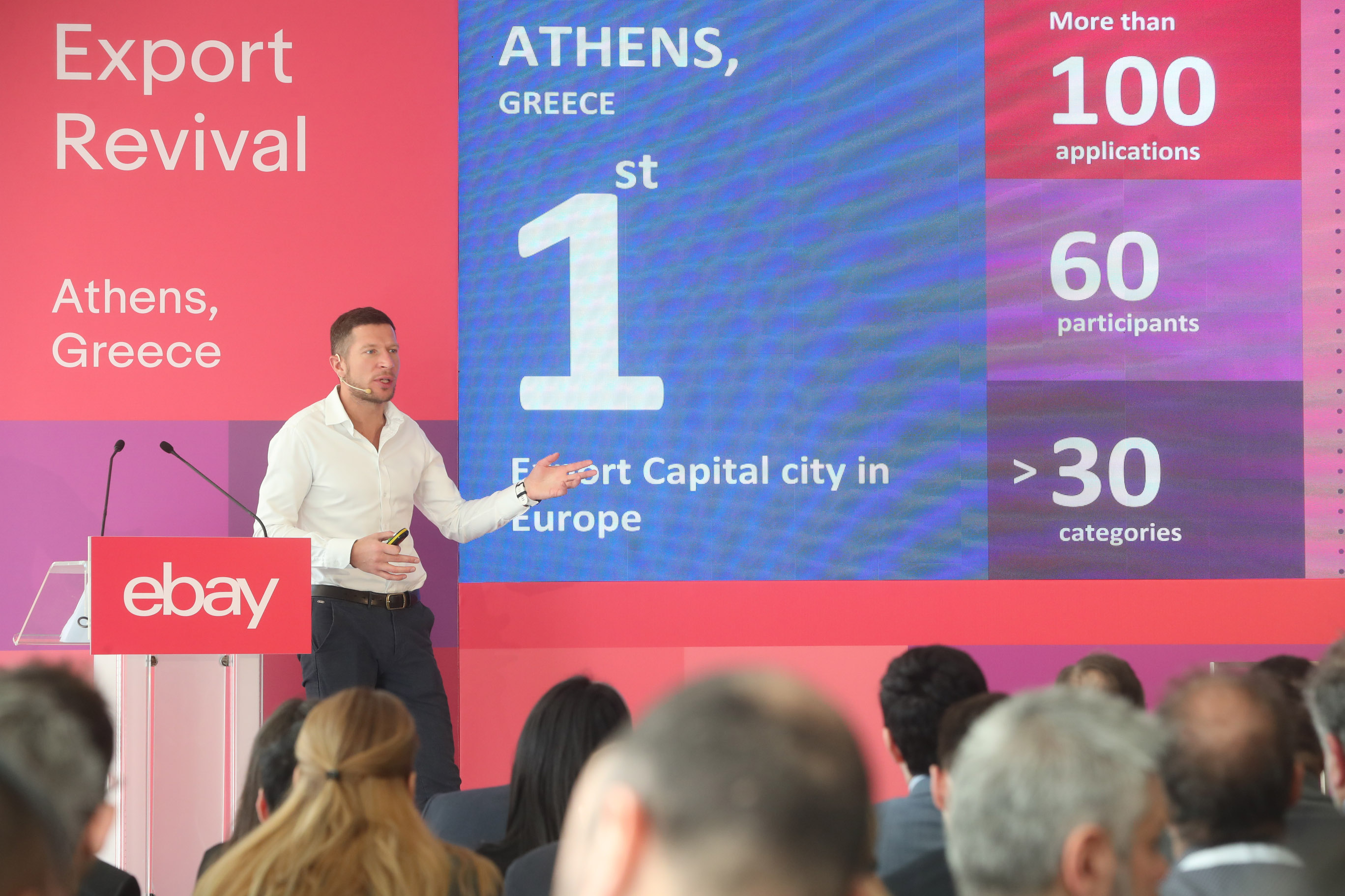 Συγκεκριμένα, κατά τη διάρκεια της ομιλίας του, ο κ. Ilya Kretov, General Manager Russia & Emerging Europe της eBay, αναφέρθηκε στη σπουδαιότητα της καινοτομίας, δηλώνοντας χαρακτηριστικά: «Σήμερα, είμαστε χαρούμενοι που η Αθήνα είναι η πρώτη πόλη – πρωτεύουσα που συμμετέχει στο εκπαιδευτικό πρόγραμμα Export Revival. Στόχος του προγράμματος είναι η προσέλκυση των ελληνικών επιχειρήσεων, η ενίσχυση της διαδικτυακής τους πρόσβασης για ένα νέο ξεκίνημα σε διεθνείς επιτυχημένες πωλήσεις. Η πρωτοβουλία ήδη έχει παρουσιαστεί και πραγματοποιηθεί σε 14 πόλεις όπως στην Plovdiv της Βουλγαρία, στη Yaroslavl της Ρωσίας, την Akron στην USA. Και τώρα ήρθε η σειρά της Αθήνας! Λάβαμε περισσότερες από 100 αιτήσεις, και 70 από αυτές επιλέχθηκαν από το πρόγραμμα. Η Ελλάδα διαθέτει μοναδικά προϊόντα και ισχυρή εξαγωγική δυναμική, η οποία έχει αποδειχθεί με την πάροδο του χρόνου: περίπου 12.000 πωλητές από την Ελλάδα δραστηριοποιούνται ήδη στην πλατφόρμα eBay, πολλοί από τους οποίους, εδώ και πάνω από μία δεκαετία, ενισχύουν και αναπτύσσουν τις επιχειρήσεις τους μέσω διεθνών πωλήσεων αξιοποιώντας την πλατφόρμα της eBay. Μόλις για το 2019 πούλησαν και εξήγαγαν σχεδόν 1 εκατομμύριο προϊόντα. Με συνεργάτες όπως το Υπουργείο Ψηφιακής Πολιτικής, Τηλεπικοινωνιών και Μέσων Μαζικής Ενημέρωσης, το Δήμο Αθηναίων, το Εμπορικό Επιμελητήριο Αθηνών και τον ΣΕΒ – Ελληνική Ομοσπονδία Επιχειρήσεων στην Ελλάδα, εργαζόμαστε σκληρά για να διατηρήσουμε αυτούς τους αριθμούς σε υψηλά επίπεδα».