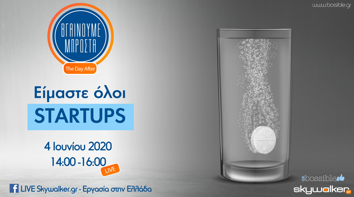 To Skywalker.gr, στο πλαίσιο της δέσμης πρωτοβουλιών του «Βγαίνουμε μπροστά», διοργανώνει την Πέμπτη 4 Ιουνίου 2020 και ώρα 14:00 έως 16:00 την ημερίδα-τηλεδιάσκεψη με τίτλο «Είμαστε όλοι startups».