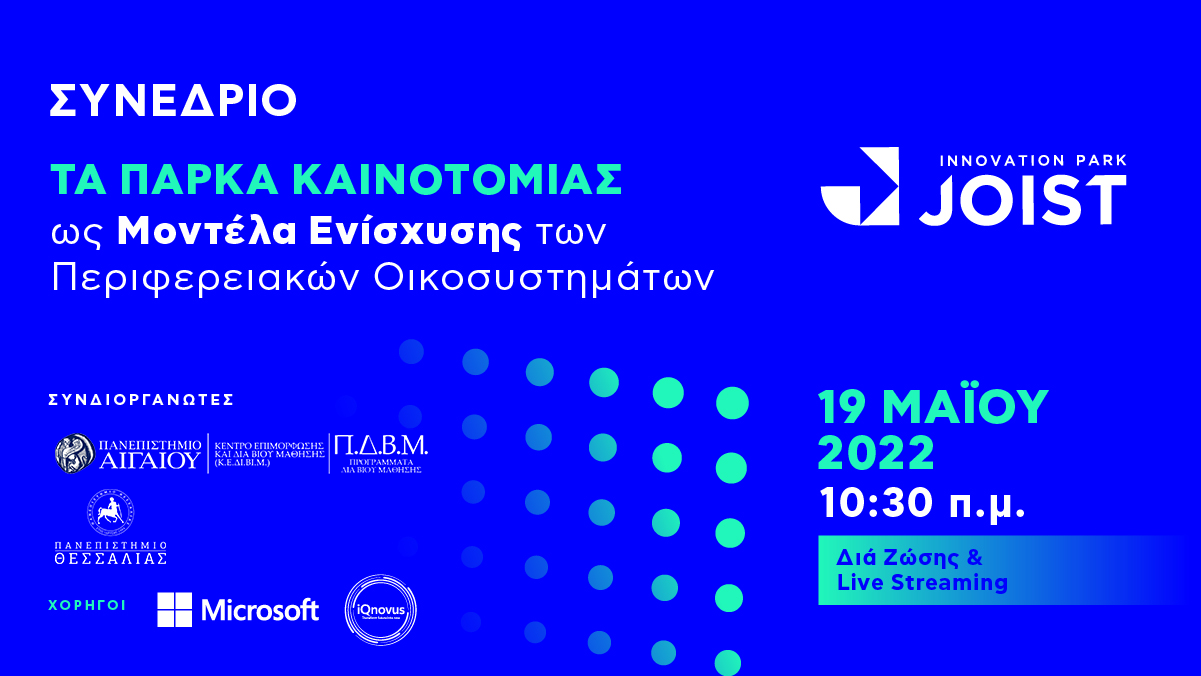 Αφουγκραζόμενο την επιτακτική ανάγκη υιοθέτησης και προσαρμογής πρακτικών ψηφιακού μετασχηματισμού στη ζωή και στην εργασία, το Πάρκο Καινοτομίας JOIST διοργανώνει σε συνεργασία με το Πανεπιστήμιο Θεσσαλίας και το Κέντρο Επιμόρφωσης και Διά Βίου Μάθησης του Πανεπιστημίου Αιγαίου, υπό την αιγίδα της Περιφέρειας Θεσσαλίας, το υβριδικό συνέδριο «Τα Πάρκα Καινοτομίας ως Μοντέλα Ενίσχυσης των Περιφερειακών Οικοσυστημάτων» την Πέμπτη 19 Μαΐου 2022, στις 10:30 π.μ., προσφέροντας τη δυνατότητα διά ζώσης συμμετοχής στη Λάρισα καθώς και online παρακολούθησης μέσω live streaming.