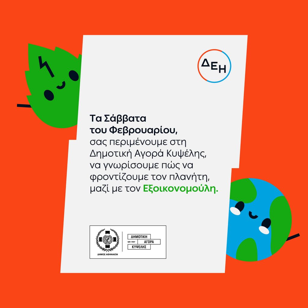 Στη Δημοτική Αγορά Κυψέλης, ο Εξοικονομούλης, ο παιδικός ήρωας της ΔΕΗ που βοηθά στην εξοικονόμηση ενέργειας, μαθαίνει στα παιδιά πώς να φροντίζουν για το καλό του πλανήτη μας. Οι μικροί φίλοι του Εξοικονομούλη θα έχουν την ευκαιρία να ζήσουν μία αξέχαστη εμπειρία, να παίξουν και να κερδίσουν πολλά δώρα. Γιατί παρέα μαθαίνουμε καλύτερα!