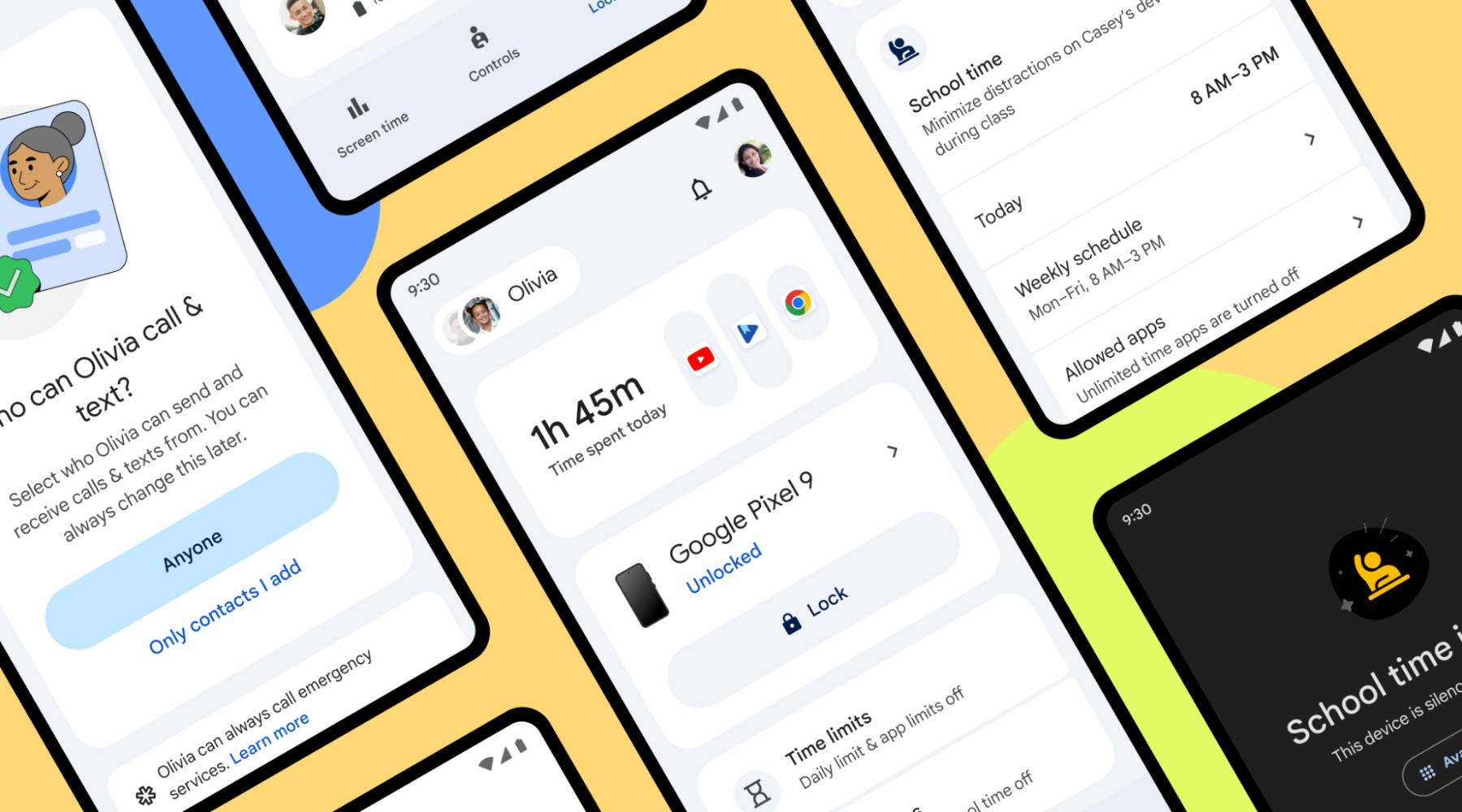 Alt text: Κολάζ τηλεφώνων σε πορτοκαλί και μπλε φόντο που δείχνει διαφορετικές δυνατότητες γονικού ελέγχου, όπως τον χρόνο που περνάει ένα παιδί στη συσκευή του και ότι το δικό του Google Pixel 9 είναι ξεκλείδωτο, με τη δυνατότητα να κλειδώνει και να ορίζονται καθημερινά χρονικά όρια.