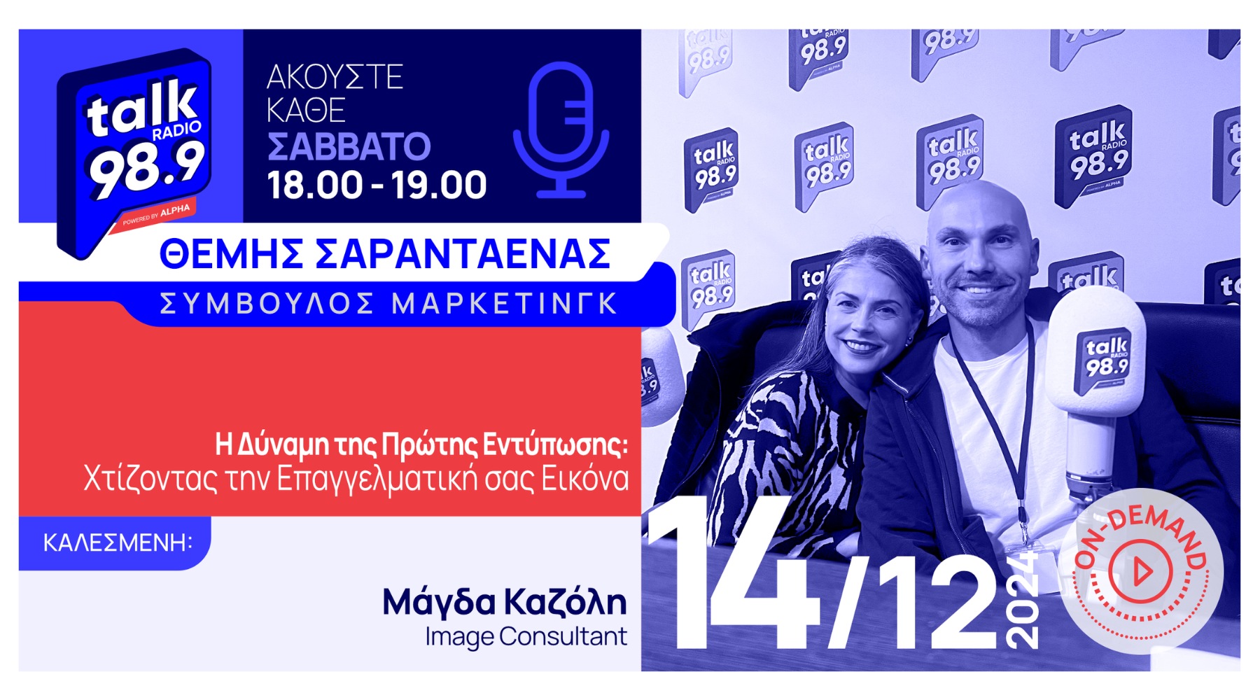 To Σάββατο 14/12/2024 ο σύμβουλος μάρκετινγκ Θέμης Σαρανταένας με καλεσμένη του στο studio του Talk Radio 989 by Alpha την Image Maker Μαγδα Καζόλη συζήτησαν για ένα θέμα που αφορά κάθε επαγγελματία, ανεξαρτήτως κλάδου ή εμπειρίας: τη δύναμη της πρώτης εντύπωσης και για το πώς μπορούμε να χτίσουμε μια επαγγελματική εικόνα που να ξεχωρίζει.